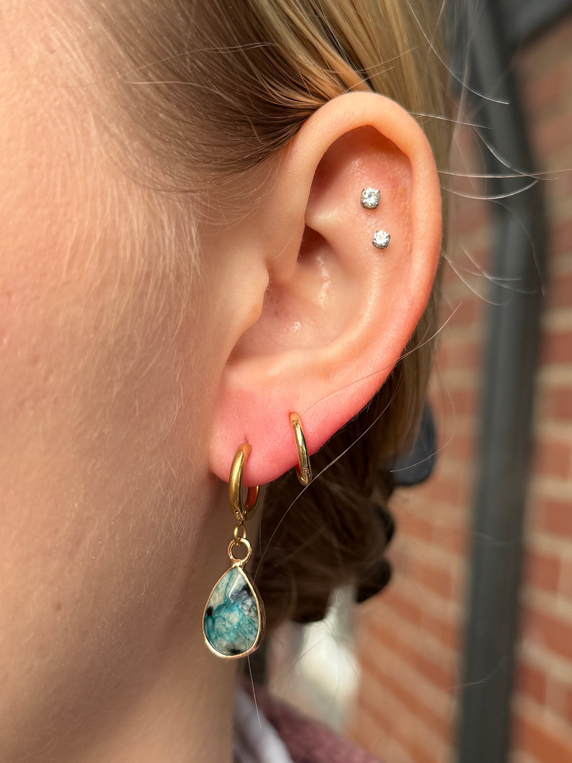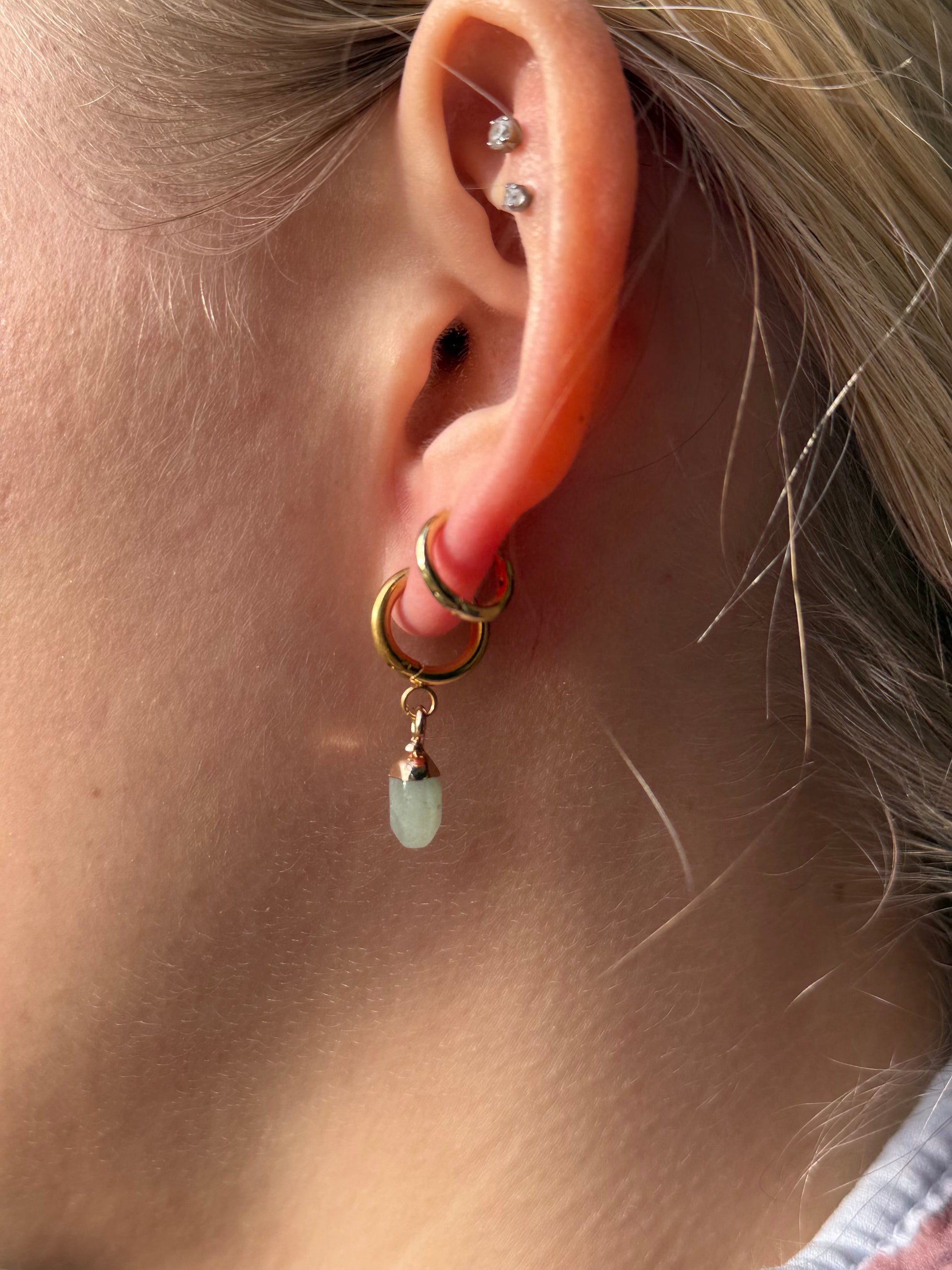 These gemstone earring sets are made with stainless steel and hypoallergenic materials. We offer a pair of our gemstone earrings in gold or silver with an option of a hook or a hoop (pictured) and a Blue Agate or a Green Aventurine gemstone. All of the materials used are tarnish free.